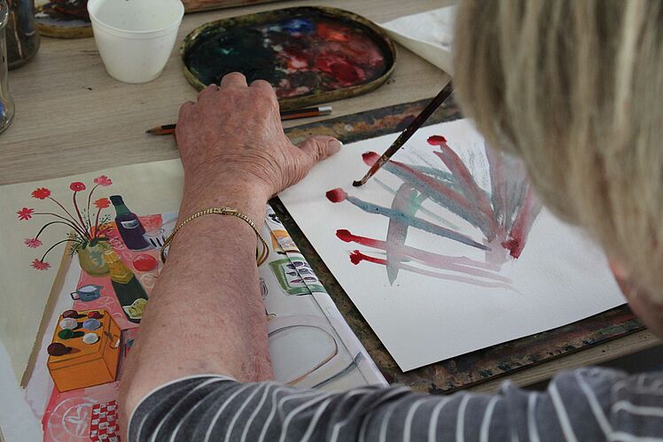 Wer den Aufenthaltsraum der AWO-Tagespflege betritt, dem fallen sie gleich ins Auge: Große bunte Aquarelle an den Wänden zeigen Landschaften,…