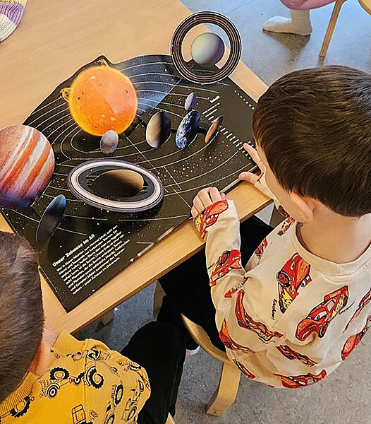 Ein Kind hatte zum Geburtstag ein Buch über Planeten und das Weltall bekommen und mit in die Kita gebracht. Als sie sich das dort anschauten, kamen immer mehr Kinder dazu und waren von dem Thema begeistert – das neue Projekt konnte starten. "Ein perfektes Beispiel für unser pädagogisches Leitprinzip 'Situationsansatz', freut sich das Leitungsteam der Kita Wundertüte.