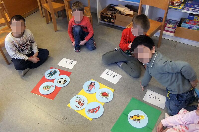 "Wir gestalteten einen gemeinsamen Begegnungskreis und boten den Kindern auf der Grundlage des Spieles 'ratz fatz in Bewegung' zahlreiche Sprachförderspiele an. Zum Beispiel wurden alle runden Plättchen, auf denen Bilder von Fahrzeugen, Essen, Spielzeug und Möbelstücken abgebildet sind, in die Mitte gelegt. Jedes Kind konnte sich eines aussuchen und beschreiben, was es darauf sieht. Damit wurde die aktive Sprache angeregt, das Kind ermutigt, Wörter zu finden und damit den aktiven Wortschatz zu trainieren sowie Sätze zu formulieren.