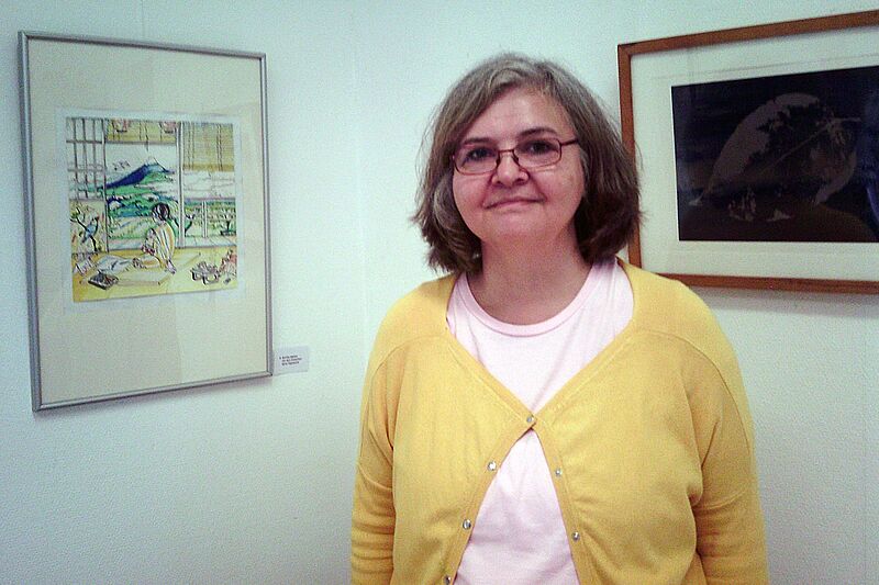Im August besuchten Kinder die Ausstellung "Farbenmeer und Blütenzauber" von Cornette Deegener und Monika Aladics. Künstlerin Monika Aladics (siehe Foto) brachte ihnen die Welt des Druckens mit Pflanzen und Collagen näher und erklärte, was sie dazu motiviert hatte, die verschiedenen Bilder zu zeichnen. Somit konnten die Kinder diese bewusster betrachten. Am Ende der Ausstellung wurden sie durch eine Blaulicht-Fluoreszenztechnik in eine magische Welt eingeladen.