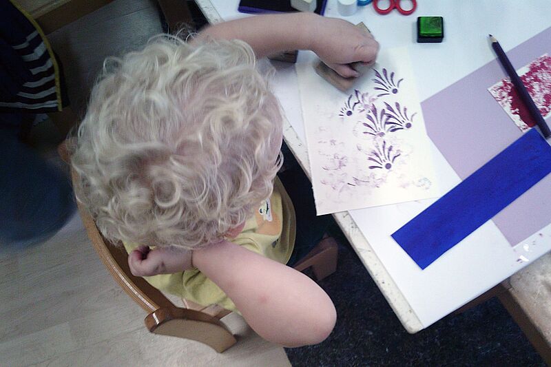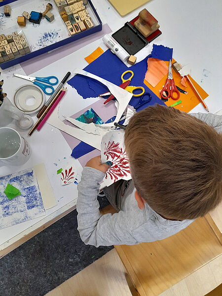 "Es waren schon Kinder ab drei Jahren dabei", erzählt Erzieherin Noemi, die die Kooperation seitens der Kita betreut. “Monika hat ihre Führung meisterhaft geleitet und sie hat daran so viel Spaß gehabt, dass sie spontan einen Workshop für Stempel und Collage angeboten hat. Am Donnerstag nach unserem Galeriebesuch hat Monika uns alle mit einem kindgerechten Arbeitstisch in der perfekten Größe überrascht – extra von ihrem Mann selbst gebaut. Darüber hinaus hatte sie Stempel aller Art mitgebracht, selbst hergestelltes farbiges Papier, Buntstifte, Scheren, Leim und überhaupt alles, was ein Kind braucht, um loszulegen. Zum Schluss hat Monika eine liebevolle und authentische Wertschätzung der Werke unserer Kinder bewiesen. Diese sind begeistert mit von Stempelfarbe bekleckerten Händen nach Hause gegangen, um stolz ihre Werke zu zeigen. Vielen Dank, liebe Monika.”
