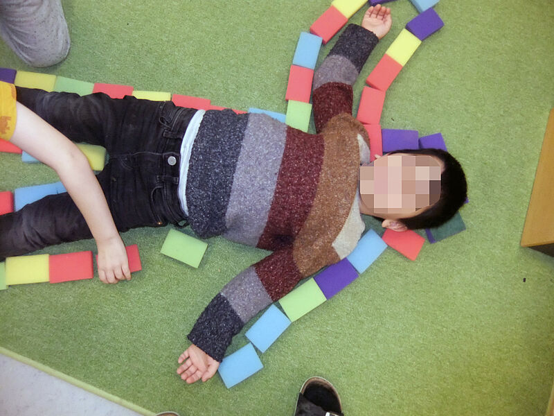 Ein weiteres Highlight war das 'Umranden', bei dem die Körperwahrnehmung und die Wahrnehmung der Körpergrenzen gefördert wurden. Ein Kind legte sich dabei auf den Boden und das andere Kind legte viele Schwämmchen um dessen Körper. Dann stieg das Kind vorsichtig aus seiner Umrandung hinaus. Beim Umlegen spürte es seine Körpergrenzen und danach konnte es die Umrandung des eigenen Körpers betrachten. Auch das andere Kind wurde darin sensibilisiert, die Körpergrenzen des Kindes wahrzunehmen, dessen Körper es umrandet hat."