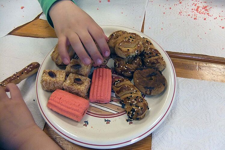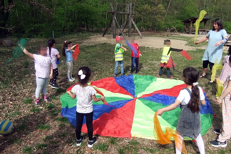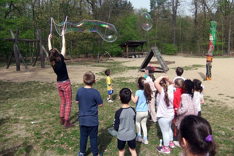 Die pädagogischen Fachkräfte hatten das Schwungtuch zum Spielen mitgebracht, es wurden Lieder gesungen und getanzt. Jedes Kind bekam ein kleines Seifenblasen-Set – die perfekte Vorbereitung für die XXL-Seifenblasen von Erzieherin Cordula. An denen durfte sich jedes Kind mal ausprobieren und wer es schaffte, eine Große Seifenblase hinzubekommen, war richtig stolz. So viele Aktivitäten machen hungrig: Neben dem Mittagessen gab es natürlich zur Feier des Tages auch Süßigkeiten, die die Kinder mitgebracht hatten.