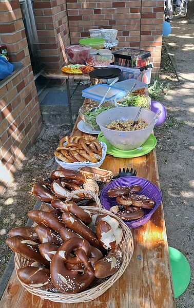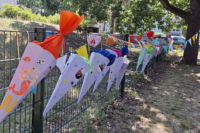 "Ende Juni haben wir die Vorschulkinder verabschiedet. Bei schönstem Sonnenschein zogen die 38 Kinder mit Tröten und Luftballons über den Kitaspielplatz und wurden lautstark von ihren Eltern und Familienangehörigen beklatscht. Nach einer kleinen Vorführung gab es bei leckerem Essen viel Zeit für Erinnerungen und Austausch über die Kitazeit, wobei einige Tränen flossen. Natürlich durften die Zuckertüten nicht fehlen.