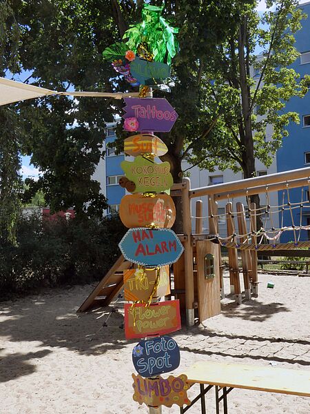 Anfang Juli feierten wir dann unser diesjähriges Sommerfest: Unter dem Motto “Hawaii” stimmten wir uns schonmal auf die Sommer- und Urlaubszeit ein. Die Kinder leiteten mit ihren einstudierten Tänzen den Nachmittag musikalisch ein, anschließend gab es viele tolle Spiele wie z. B. Kokosnuss-Kegeln, Limbo oder Muschelsuche. Außerdem konnten Blumen als Haarschmuck gebastelt werden. An der Tiki-Bar gab es sommerliche Getränke und am Foto-Spot konnten tolle Erinnerungsfotos gemacht werden. Auch Zahnputz-Krokodil Kroko und die Bewegungscoaches waren wieder dabei und hatten ebenfalls spannende Angebote. Alle hatten einen tollen Nachmittag!"