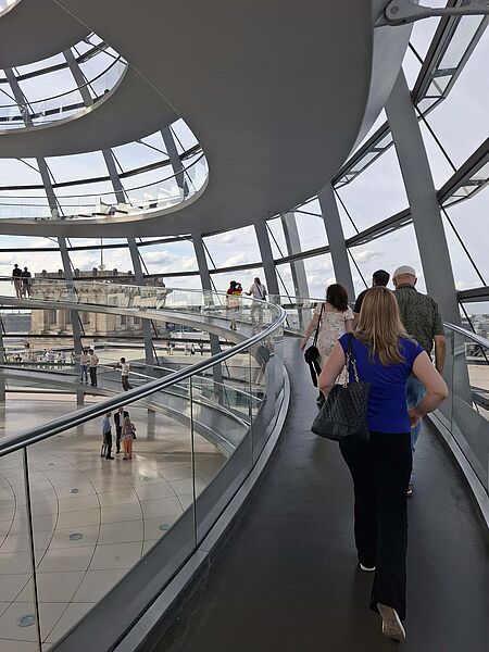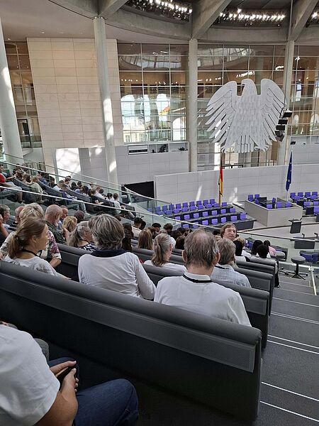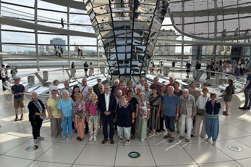 Anschließend folgte die Stadtrundfahrt durch das Berliner Regierungsviertel. Gestärkt vom Mittagessen im Restaurant "mama trattoria" fanden sich alle zum Sicherheitscheck am Reichstagsgebäude ein. Bei der Besichtigung des Plenarsaals gab es einen Vortrag über die Aufgaben und die Arbeit des Parlaments. Eine Sitzung fand an diesem Tag nicht statt – die Abgeordneten hatten noch Sommerpause. Dank strahlendem Sonnenschein konnten alle nach der Diskussion mit Helmut Kleebank und dem gemeinsamen Fototermin die fantastische Aussicht von der Kuppel des Reichstagsgebäudes genießen.