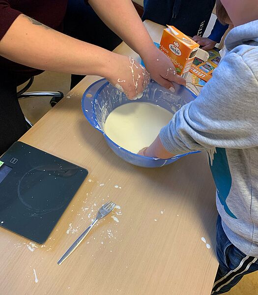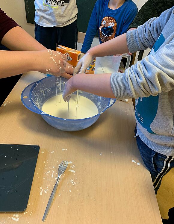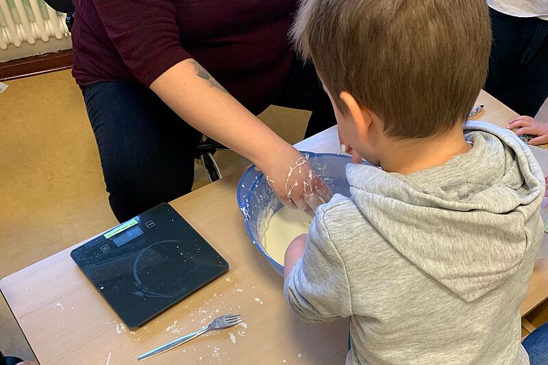 Fast jeder Haushalt hat Speisestärke in der Vorratskammer. Vermischt mit Wasser, ergibt das keine klebrige Pampe, sondern sorgt für ein überraschendes Wohlfühlerlebnis, erzählt Kita-Leiterin Birgit Gersch: "Wenn man die Hände eintaucht, fühlt sich das ganz weich und sanft an". Ihr Stellvertreter Gordon Krüger ergänzt: "Man kann die Masse kneten, aber sie gleitet dann ganz leicht von der Hand". Was zurückbleibt, erfordert kein Spezialkommando zum Saubermachen, einfaches Händewaschen reicht vollkommen aus. Denn die Speisestärke hinterlässt lediglich ein Gefühl "wie wenn man Kartoffeln geschält hat", so Krüger weiter.